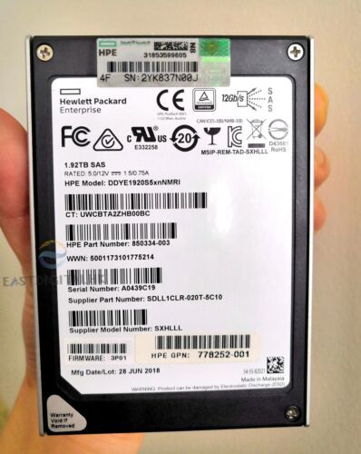 1.92TB SSD HPE 2.5 12Gbs SAS DDYE1920S5xnNMRI SXHLLL 3P01 778252-001 850334-003