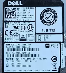 383N9 0383N9 AL14SEB18EP DELL 1.8TB 10K 12G SFF 2.5" SAS 4KN HARD DRIVE
